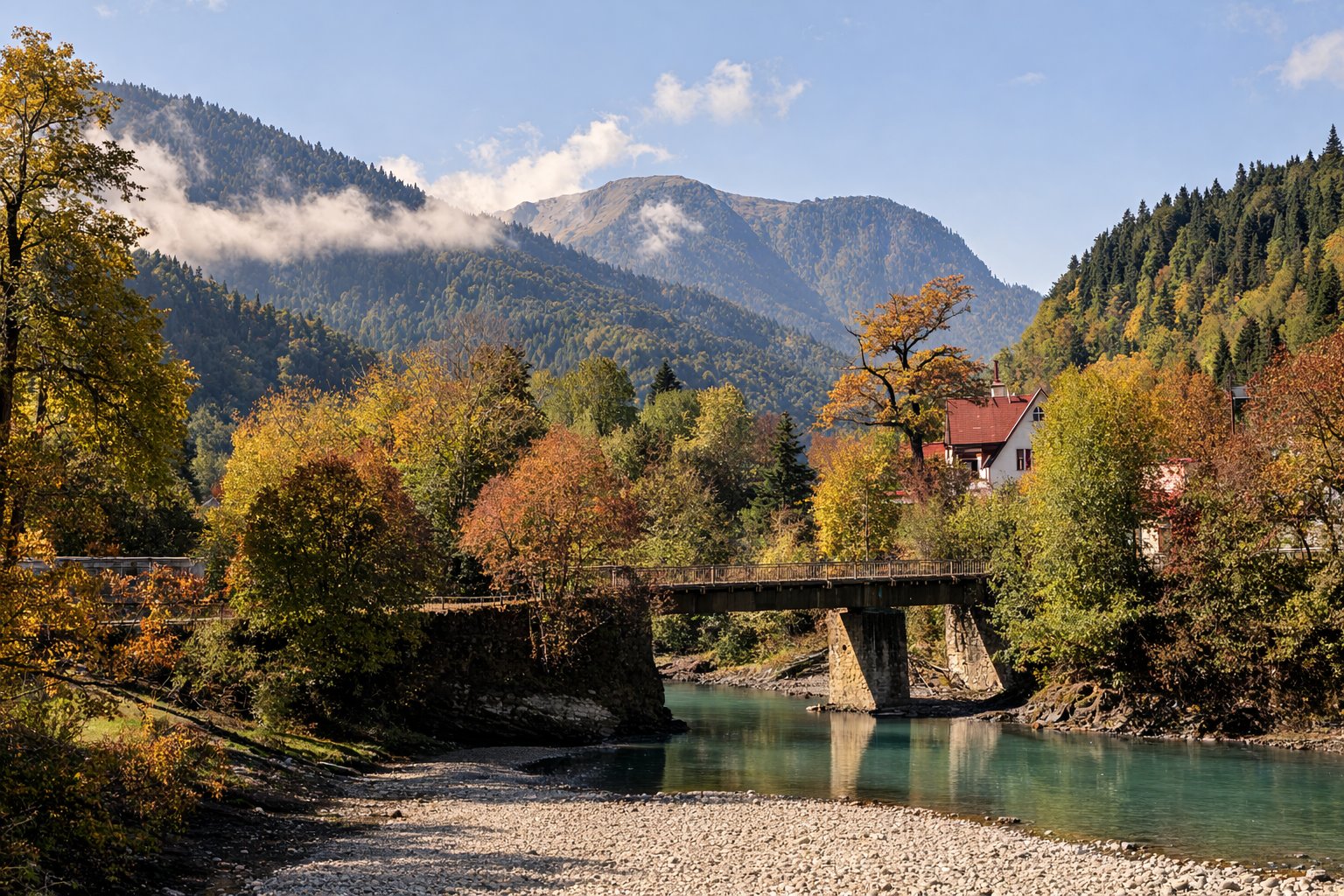 Чаще всего в первую поездку выбирают Каменномостский (Хаджох). Это самый понятный туристический узел для старта: здесь много жилья, есть кафе и магазины, а рядом находятся Хаджохская теснина, Руфабго и Мишоко. Удобно выезжать в разные стороны и не тратить много времени на дорогу. Летом здесь шумнее и плотнее поток туристов, но для первой поездки это один из самых удобных вариантов.