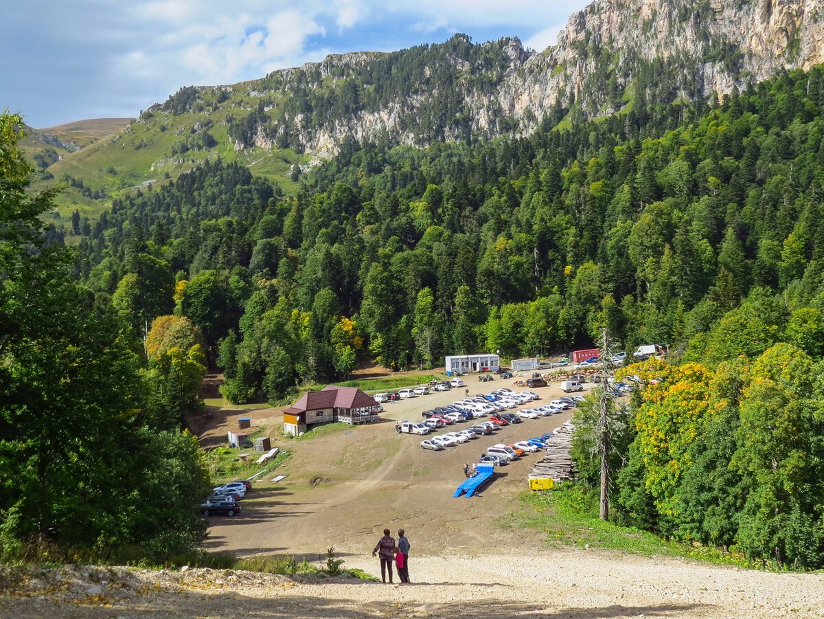 Отдельная ветка дороги выше Гузерипля. Здесь заканчивается асфальт, дальше идут только пешие маршруты. На месте многие задерживаются дольше, чем планировали: гуляют вокруг озера, отдыхают и просто сидят с видом на горы.